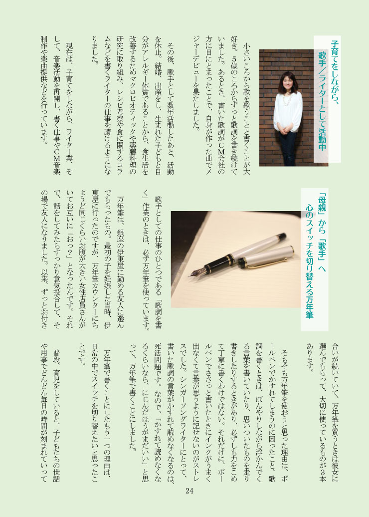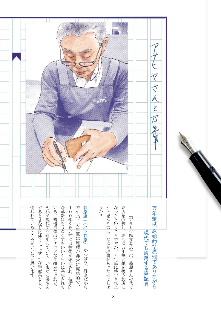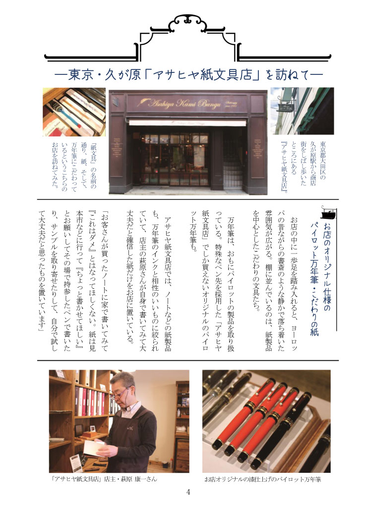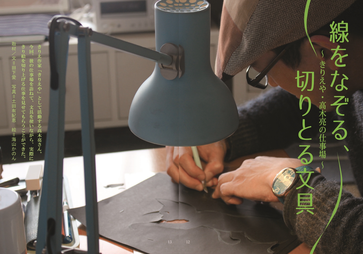 東京久が原の「アサヒヤ紙文具店」さん訪問取材、きりえ作家・高木亮さん、シンガーのAMIKAさん、キッチンスタジオ・オーナー・梅村小百合さんなど、各方面で活躍されている方のお気に入り文具を紹介していただくインタビューなどの記事を掲載。